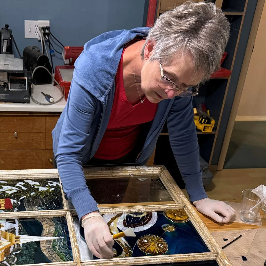 I’m still enamored with light on glass; therefore, my oh-so-clever designer name is N. Lighten Designs. I’m not creating huge church windows, but I still hope to inspire awe. The biggest ka-ching moment for me is when I lift one of my pieces out of the box, hold it up to the window, and see someone’s face light up as the glass suddenly leaps to life. Let there be light!