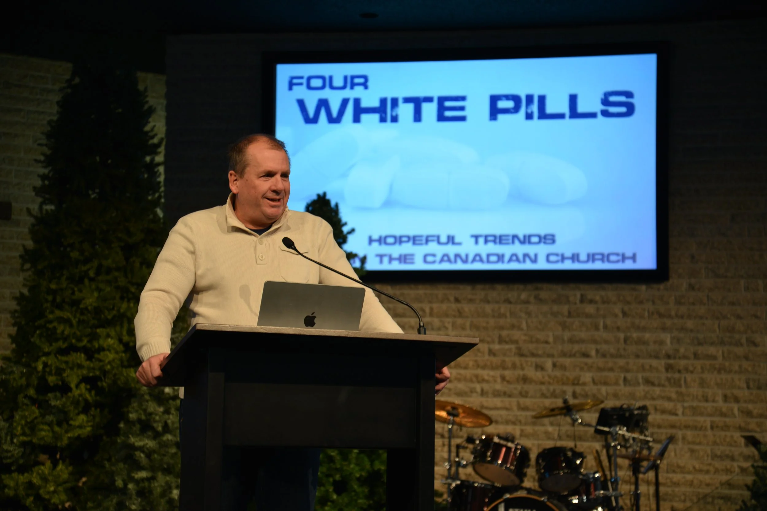 The four white pills—“nuggets of possibility” in what seems to be a negative situation—are kids' ministry, men’s ministry, biblical integrity, and genuine experiences.