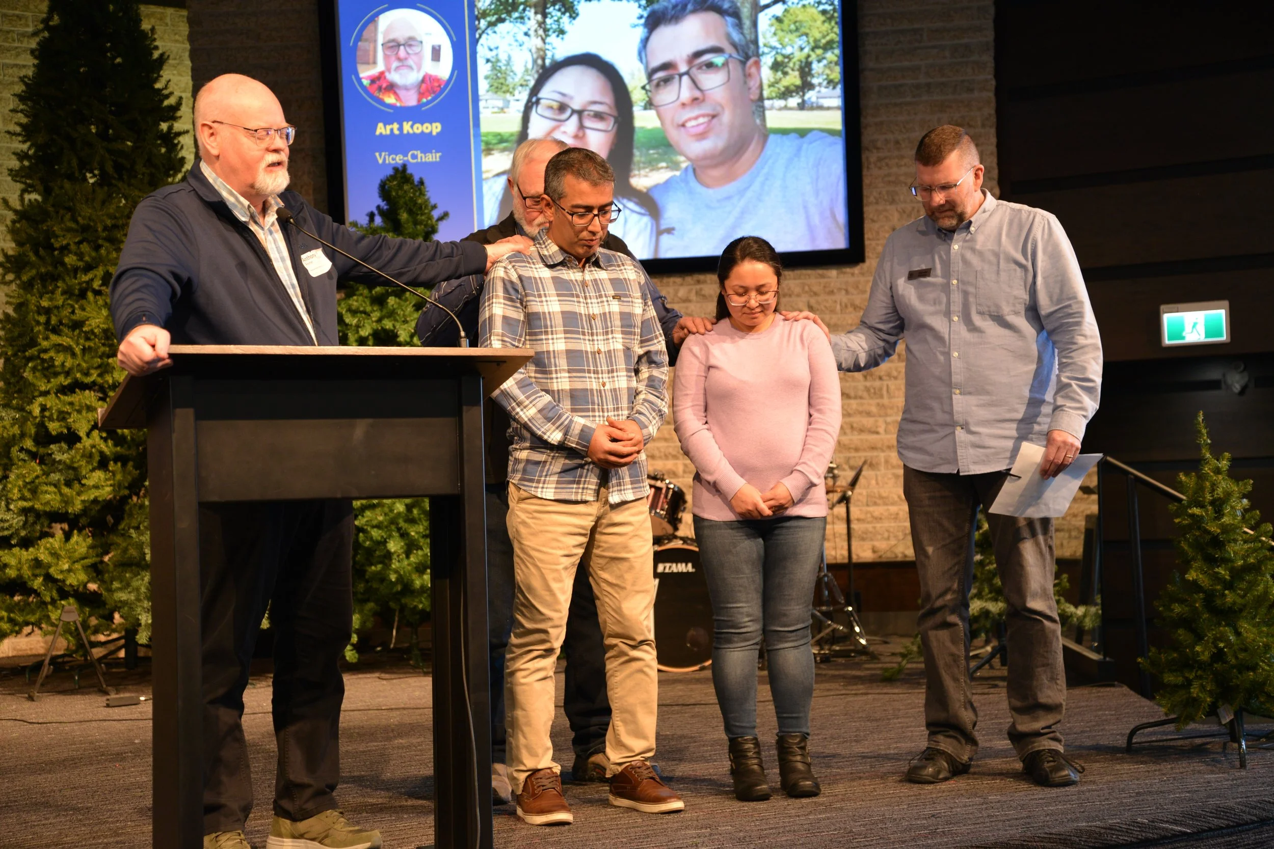 On behalf of the Board of Missions, Anthony Reimer led in prayer for Reza and Bahar Azimi, EMC’s newest missionaries. While based in Manitoba, their ministry is primarily online to Afghans around the world.